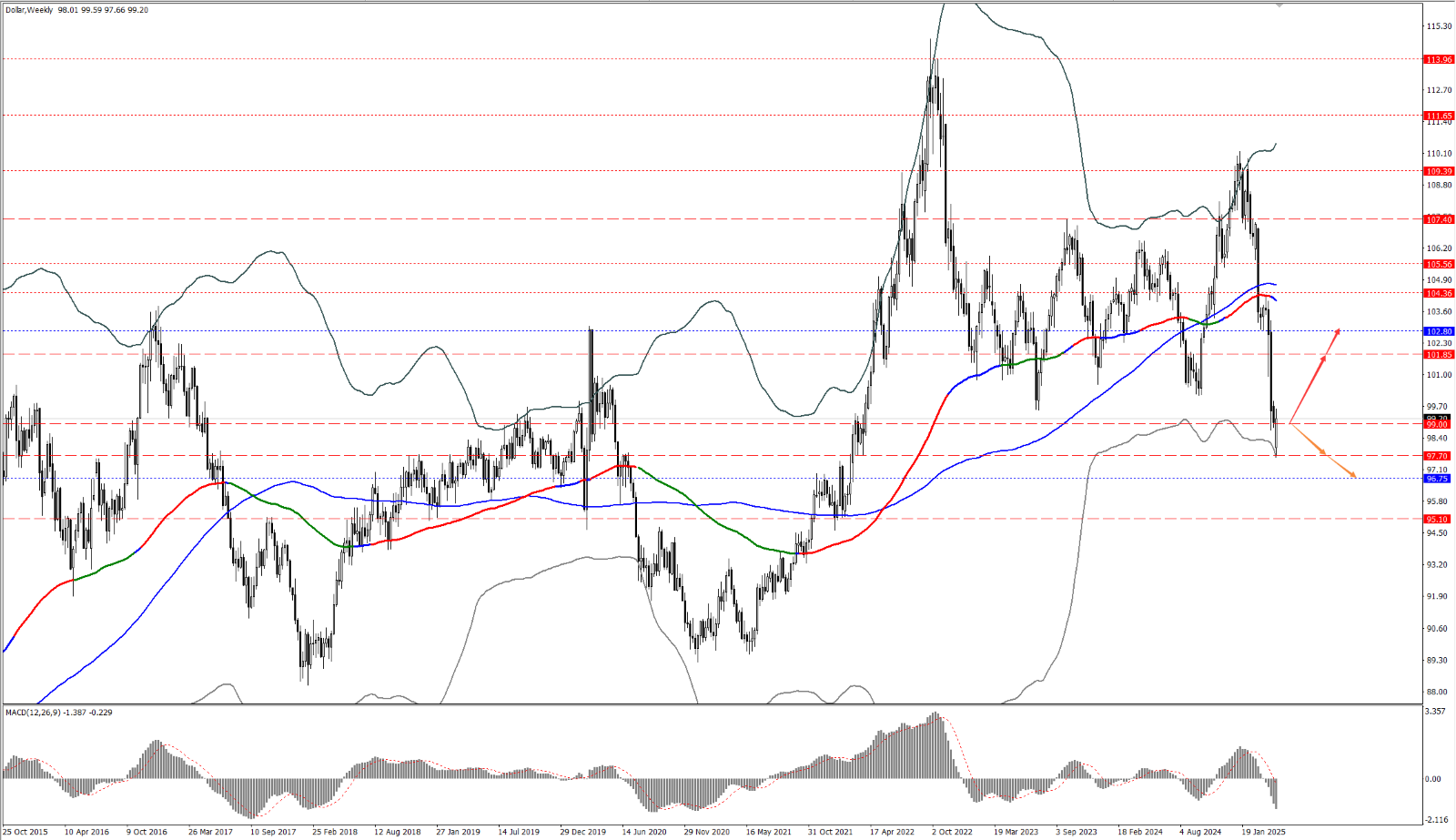 • 이번 주에도 99선에서의 다소 불확실한 변동을 주의 깊게 살펴야 합니다. 만약 달러 지수가 99선 근처에서 안정세를 보이며 반등한다면 101.85와 102.80 두 저항선에 주목해야 합니다.