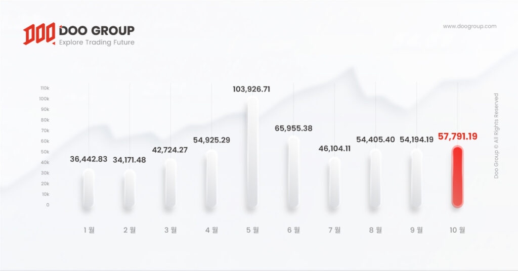 Doo Prime은 올해에 들어 거래량에서 꾸준한 성장을 보이고 있습니다. 5월 총 거래량이 파격적으로 증가한 것을 제외하고는 다른 달의 거래량은 기본적으로 꾸준한 상승세를 유지했습니다. 10월 들어 비농업 데이터 발표와 미 연준의 금리인상 정책 등 뜨거운 이슈가 잇따르면서 시장 실적은 비교적 밝은 흐름을 보였고 결국 10월 거래량은 전월 대비 꾸준히 상승했습니다. 연초부터 현재까지 Doo Prime의 총 거래량은 5,506.41억 달러로 지난해 같은 기간보다 120.17% 증가했습니다.