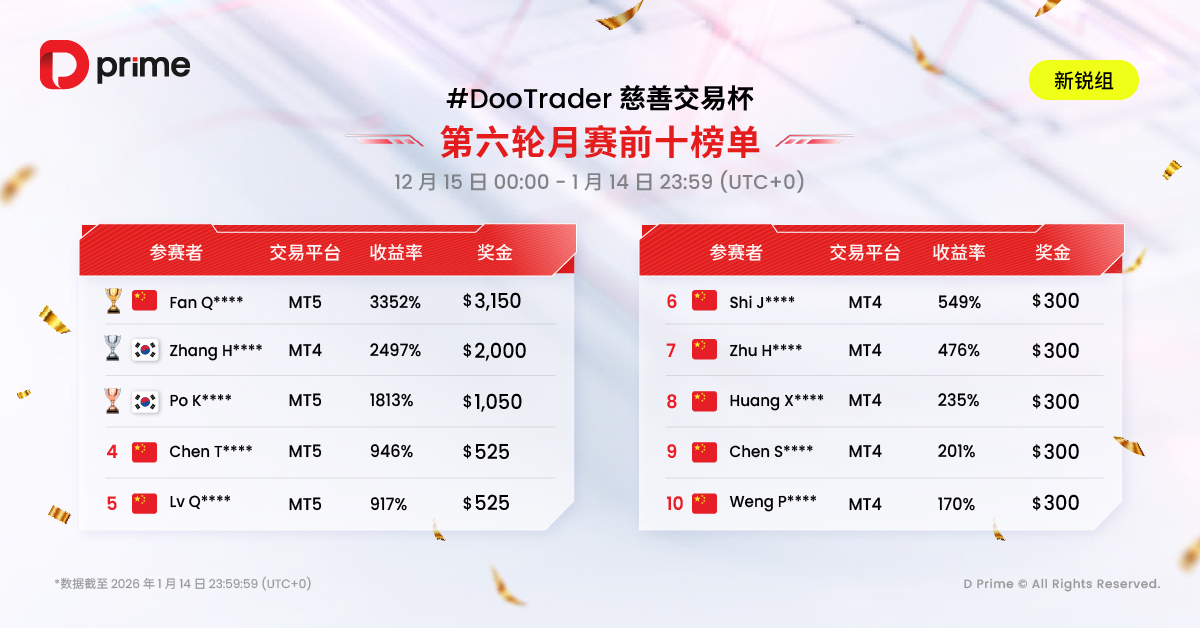 D Prime #DooTrader 자선 트레이딩 제6라운드 월간 대회가 1월 14일 23:59(UTC+0) 기준으로 성황리에 막을 내리며 치열했던 결과 랭킹이 공개되었습니다! 반년에 걸친 치열한 경쟁 끝에 6차례의 월간 대회가 모두 마무리되었으며 대회는 이제 서바이벌 아일랜드 최종 결전 단계로 공식 진입했습니다!