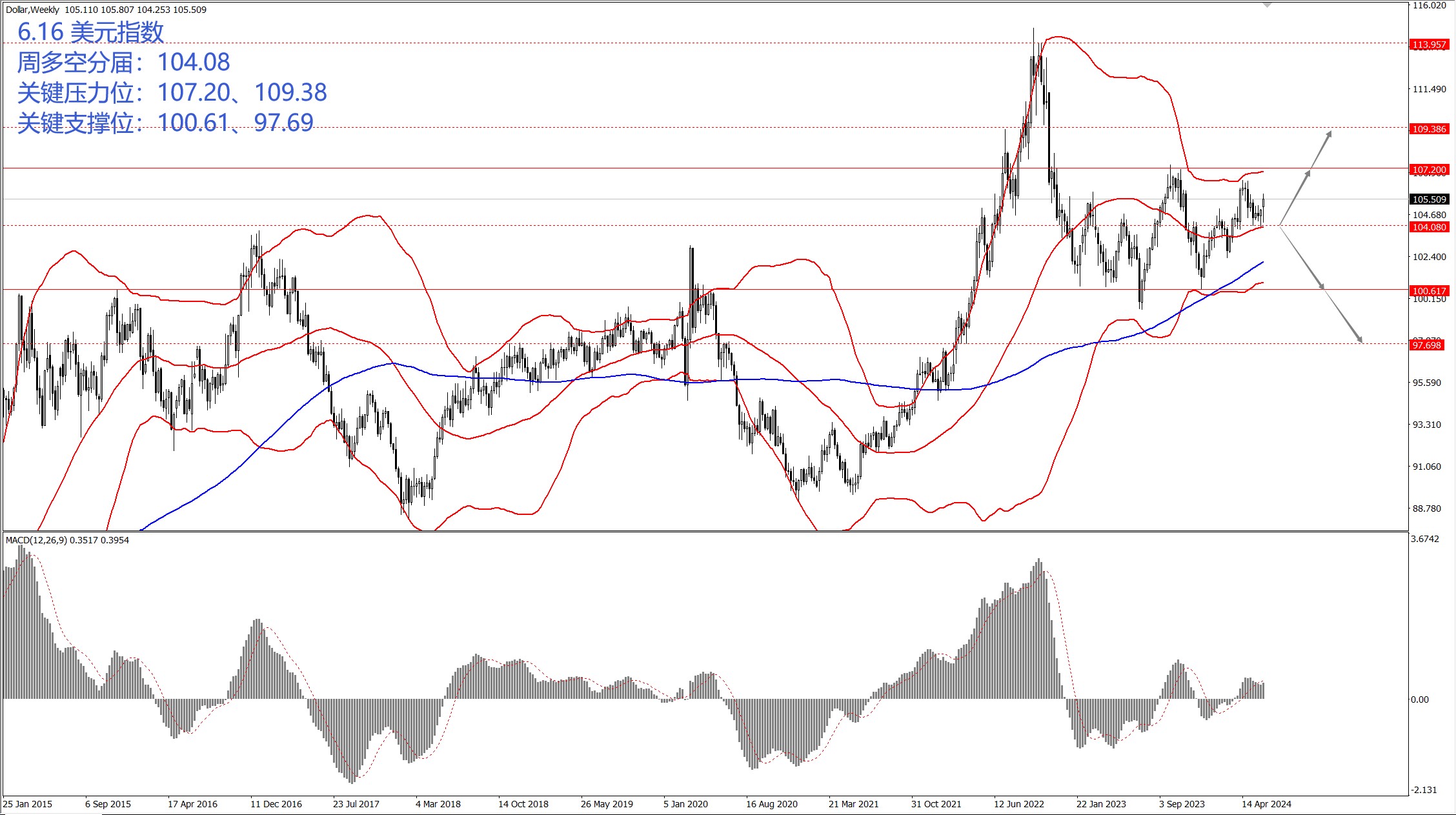 • 从技术层面上,下周主要关注周多空分届 104.08 一线,如果美指运行于 104.08 一线上方,届时则关注区间上边界 107.20 和 109.38 两个位置的压制力度,尤其关注震荡区间上边界 107.20 一线的压制力度;