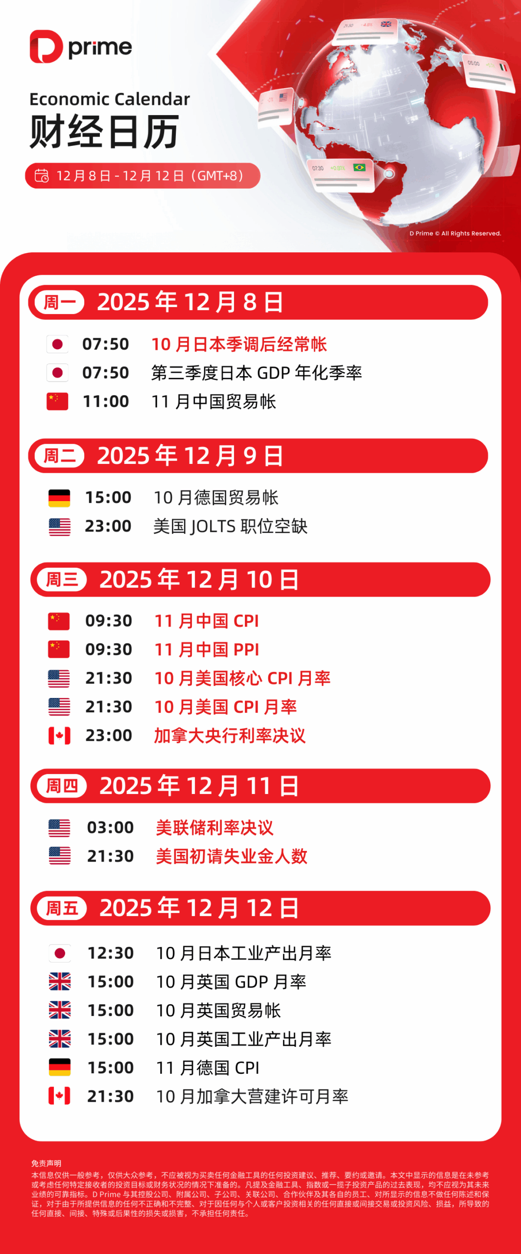 财经日历 | 以下为 2025 年 12 月 8 日至 2025 年 12 月 12 日(GMT+8 北京时间) 全球重大经济事件提醒。在重大行情期间,请确保您已审查您的保证金率,并有足够的保证金来支撑您的风险敞口。
