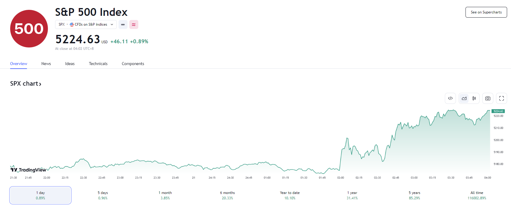 在 FOMC 会议之后,美股尾盘涨幅迅速扩大,美股指数均连涨三日,标普大盘连续两日创收盘历史新高,史上首次升破 5200 点,道指和纳指也创新高。