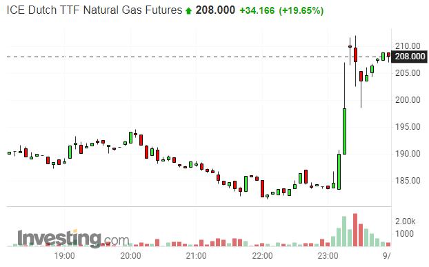 投资者对于欧洲天然气供应短缺的担忧加剧,导致欧洲天然气价格大幅走高。被视为欧洲天然气价格风向标的荷兰 TTF 天然气期货价格一度涨至 212.415 欧元,日内涨幅达 22.19%,最终收涨 7.06%,报 186.099 欧元/兆瓦时,终结四日连跌,远离周一所创的收盘低位。