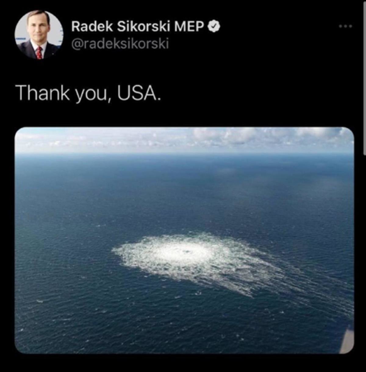 就在众人对幕后黑手众说纷纭时,波兰前外交部长拉多斯瓦夫·西科尔斯基在社交媒体上发文:“谢谢你,美国。”文字下方还配有“北溪- 2 ”管道爆炸的图片。