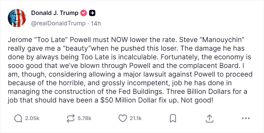 他在发文中表示,“我正在考虑对鲍威尔采取重大法律行动,因为他在美联储大楼翻修的管理上极其糟糕、无能。本应耗资 5000 万美元的项目,竟然花了 30 亿美元。这可不妙!”