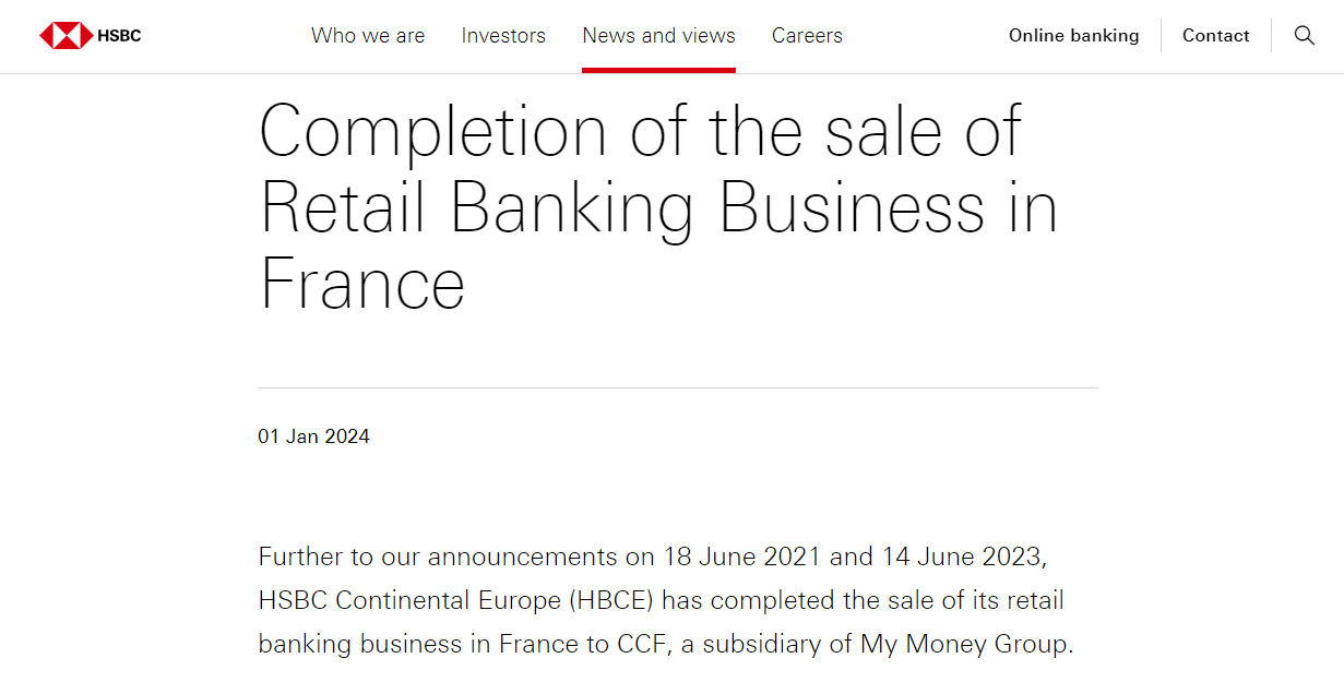 1 月 1 日,汇丰银行在一份声明中表示,“我们获得了所有必要的监管批准,子公司 HSBC Continental Europe(HBCE)已完成将其在法国的零售银行业务出售给 My Money Group 的子公司 Crédit Commercial de France(CCF)。”