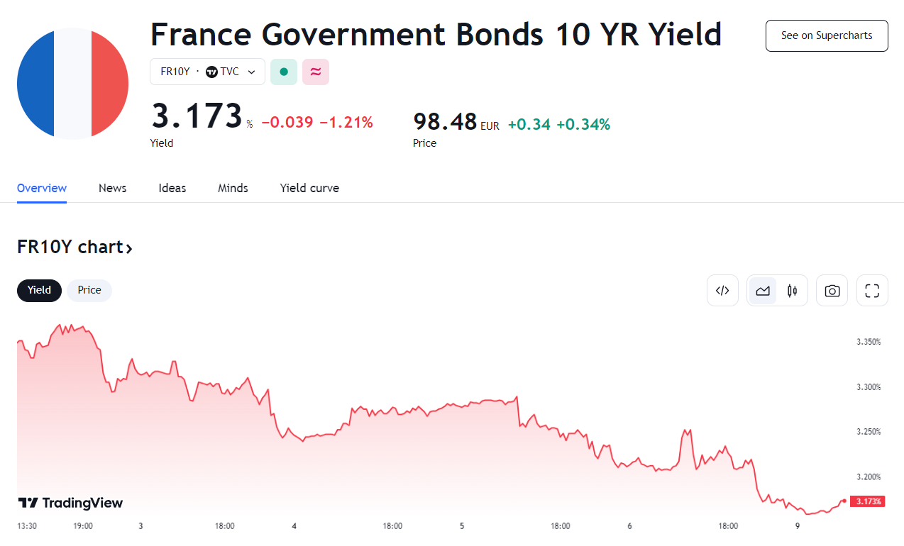 法国 10 年期国债收益率跌 4.5 个基点,报 3.167%,在左翼联盟于法国国会周日选举中以黑马方式胜出的情况下,全天呈现出“高开低走”状态,日内整体交投区间为 3.259%-3.164%。