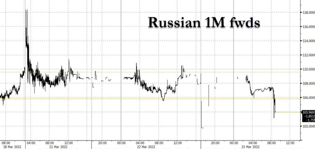 路透社报道,俄罗斯将对“不友好”国家和地区出口的天然气改用卢布结算的消息发布后,卢布对美元汇率当天一度跃升至三周来最高点,最终收报 97.7 卢布兑换 1 美元。