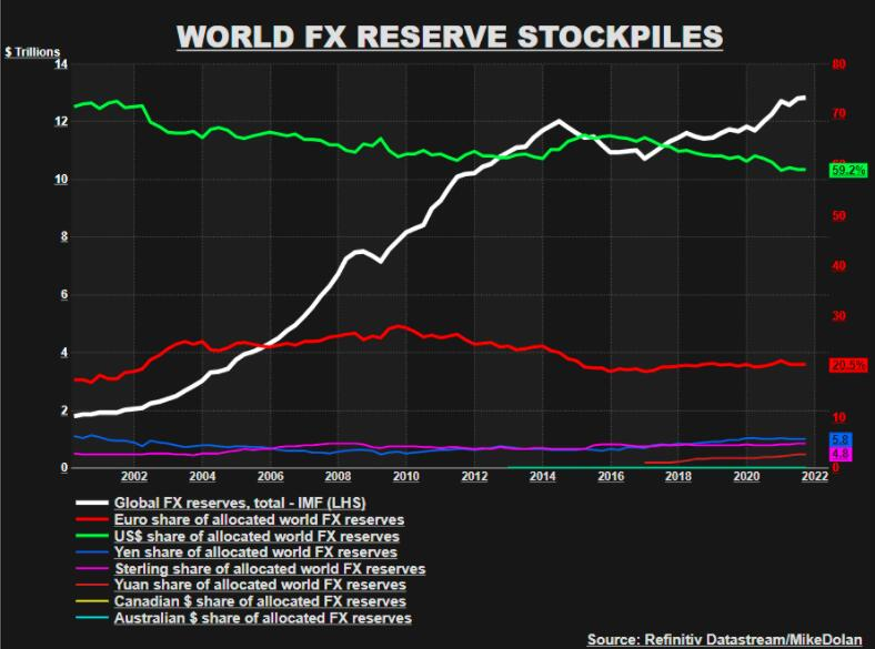 根据路透社的统计,截至去年底,全球央行外汇储备总计已达到了 12.83 万亿美元的天量水位,过去 20 年来增加了 11 万亿美元。这些外汇储备多数以美国及欧洲政府票据及债券形式持有,美元占比近 60%,欧元占比约 20%。