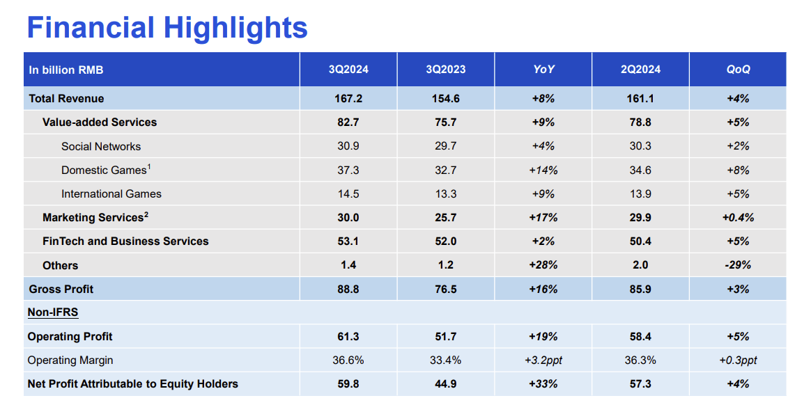 腾讯第三季度财报亮点如下: