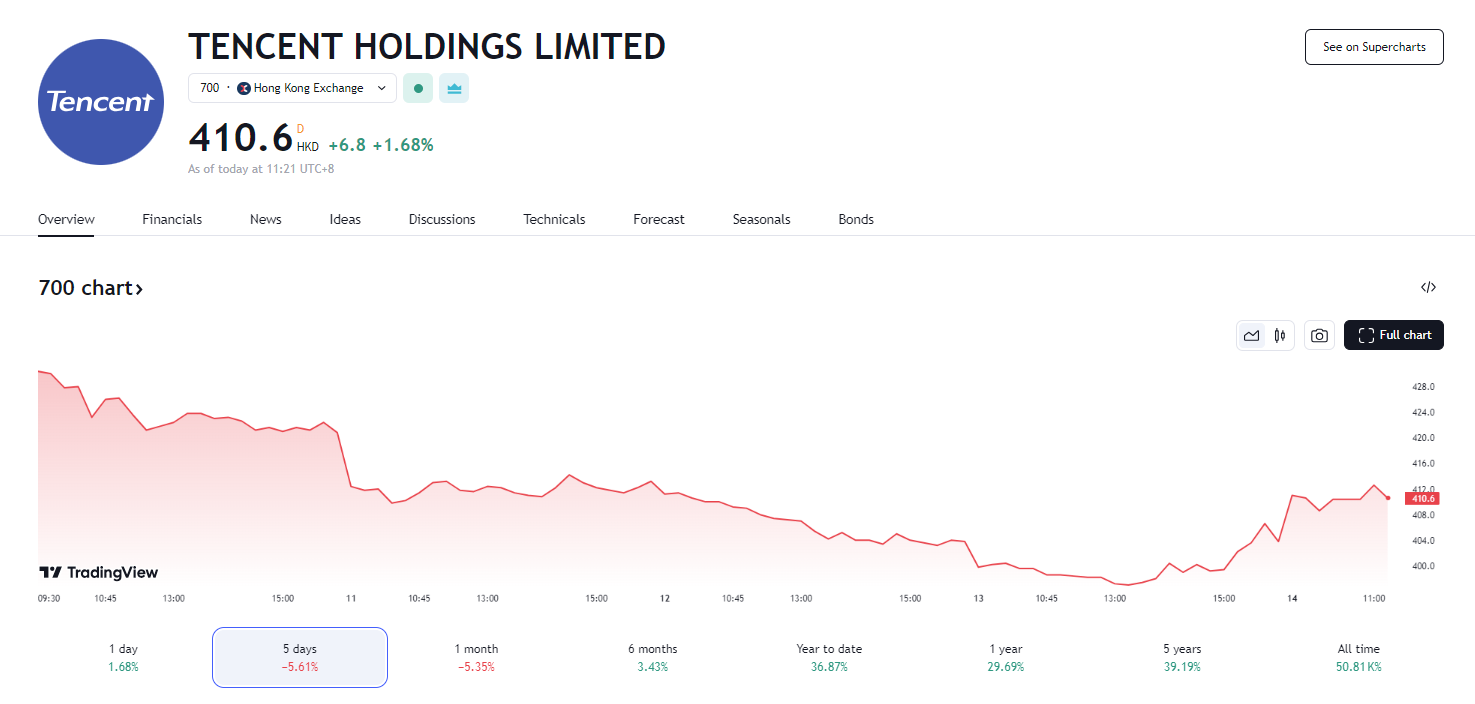 发布业绩后的腾讯(0700.HK)14 日早盘低开 0.54%,报 401.6 港元,随后涨约 1.7%。