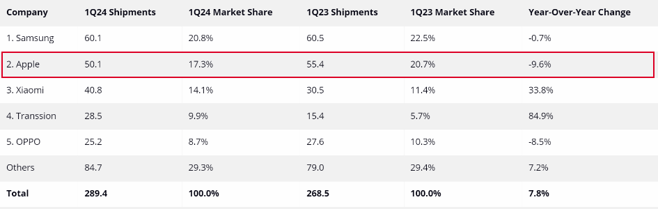 根据最新的 IDC 市场研究报告显示,苹果(AAPL)在2024 年第一季度的iPhone 出货量意外下跌了 9.6%,仅达到 5010 万部,低于分析师预期的 5170 万部。苹果在中国市场面临持续的销售困难,尤其是自去年 9 月推出最新型号以来。这主要是由于华为、小米等竞争对手的快速恢复以及北京对外国装置在工作场所使用的限制政策所导致。