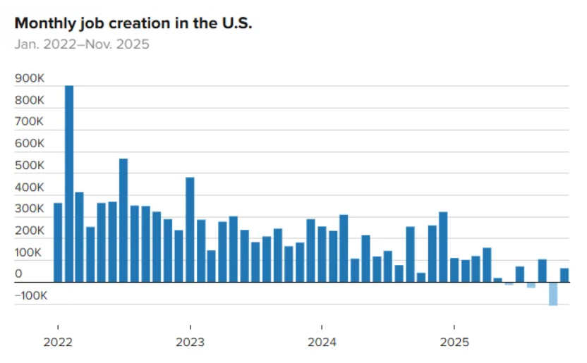 12 月 16 日至 17 日,美国 11 月就业数据显示劳动力市场持续降温,但尚未出现明显失速迹象。非农新增就业人数为 6.4 万人,失业率上升至 4.6%,创 2021 年以来新高。分析指出,本次数据受政府部门裁员及一次性因素影响较大,对经济前景的警示意义有限。