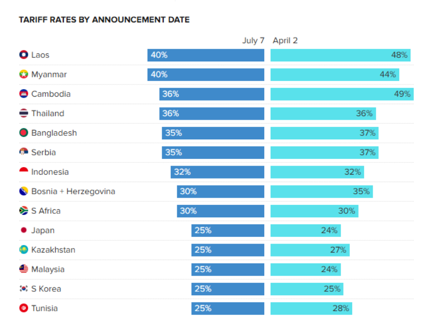 当地时间 7 月 7 日,美国总统特朗普近日签署行政命令,将“对等关税”的暂缓实施期限由 7 月 9 日延长至 8 月 1 日。同时,宣布自 8 月 1 日起对 14 个国家实施高于 10% 的新关税,其中老挝和缅甸的税率最高,达 40 %。