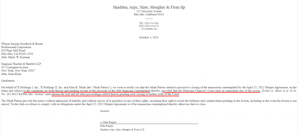 二、本次收购继续进行的前提条件之二,是推特对马斯克方面的诉讼立即暂停 ,并且和本案有关的的一切法律行动立即停止。