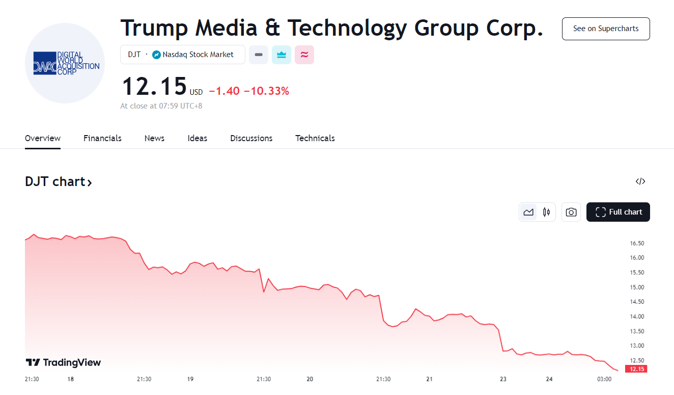 特朗普媒体科技集团的股价曾在上市后触及 79.38 美元的高点,交易员认为这是对特朗普将再度入主白宫的投机押注。然而,自 3 月底上市以来,特朗普媒体科技集团的股价已经下跌了近 85%。在特朗普失去了在民意调查中对民主党总统候选人哈里斯的领先地位后,再加上投资者担心内部人士会在禁售期结束后抛售股票,DJT 在近期加速下跌。