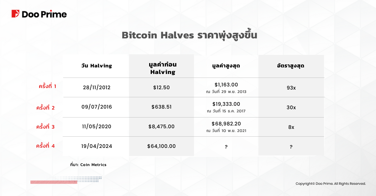 ข้อมูลในอดีตเผยให้เห็นแนวโน้มที่น่าสนใจ คือ ราคา Bitcoin มีแนวโน้มที่จะพุ่งสูงขึ้นหลังจากเหตุการณ์ Halving เราสามารถเห็นได้อย่างชัดเจนในแผนภูมิด้านบน ซึ่งแสดงให้เห็นถึงราคาที่เพิ่มขึ้นอย่างน่าตกตะลึงหลังจาก Bitcoin Halving แต่ละรอบ แม้ตอนแรกราคาจะดูนิ่ง แต่มูลค่าของ Bitcoin ก็เพิ่มขึ้นอย่างต่อเนื่องในช่วงหลายเดือนและหลายปีหลังจากเหตุการณ์ Bitcoin Halving   ซึ่งตอกย้ำสถานะของ Bitcoin ในฐานะแหล่งเก็บมูลค่าและสินทรัพย์การลงทุน