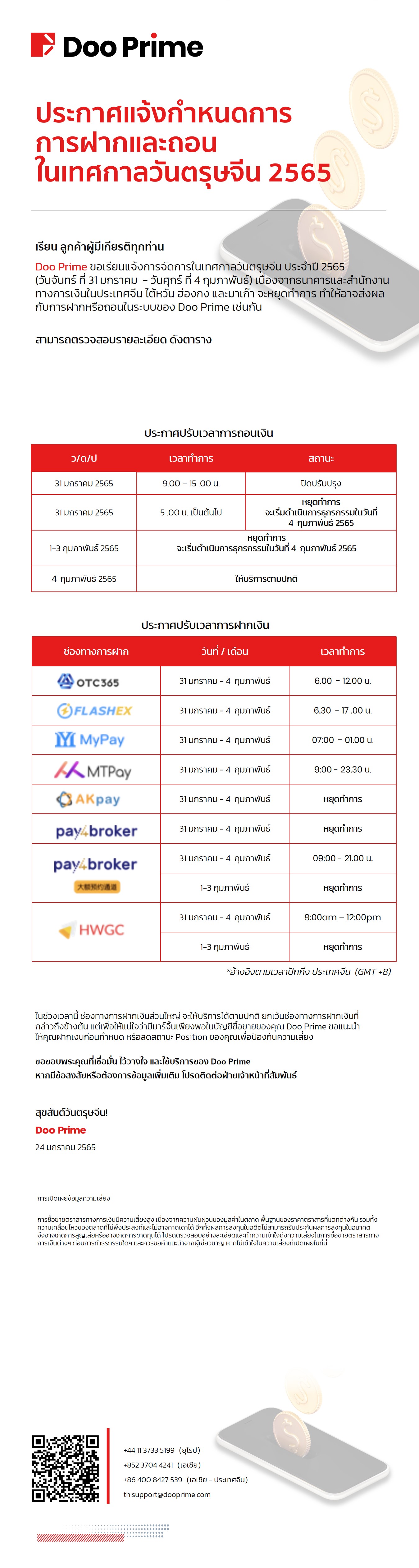 Doo Prime แจ้งปรับการฝากและถอนในเทศกาลตรุษจีน 2565