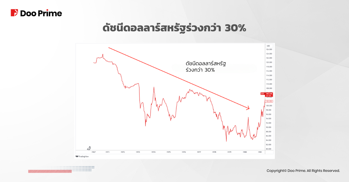 ตรงกันข้ามกับทองคำ เงินดอลลาร์สหรัฐมีการอ่อนค่าลงอย่างมากในช่วงภาวะ Stagflation ในช่วงทศวรรษ 1970 ถึงต้นทศวรรษ 1980 ดัชนีดอลลาร์สหรัฐสูญเสียมูลค่าไปมากกว่า 30% สะท้อนถึงแรงซื้อที่ลดลงท่ามกลางภาวะเงินเฟ้อที่ลุกลามและความไม่มั่นคงทางเศรษฐกิจ