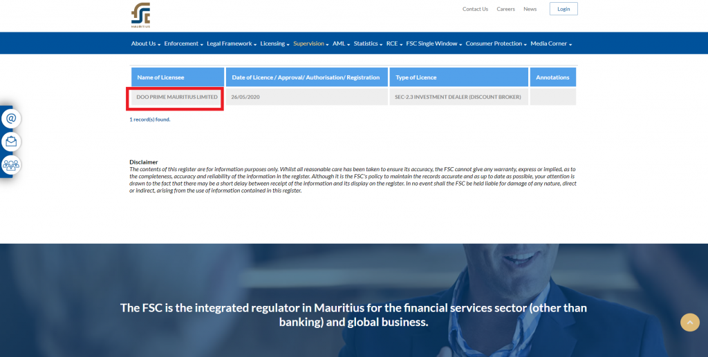 บริษัทที่ให้บริการทางการเงินที่ได้รับการรับรองอย่างถูกต้อง จะแสดงรายละเอียดทางกฎหมายและให้รายละเอียดเกี่ยวกับทะเบียนของผู้รับใบอนุญาต (Mauritius FSC Register) เมื่อได้รับการตรวจสอบ