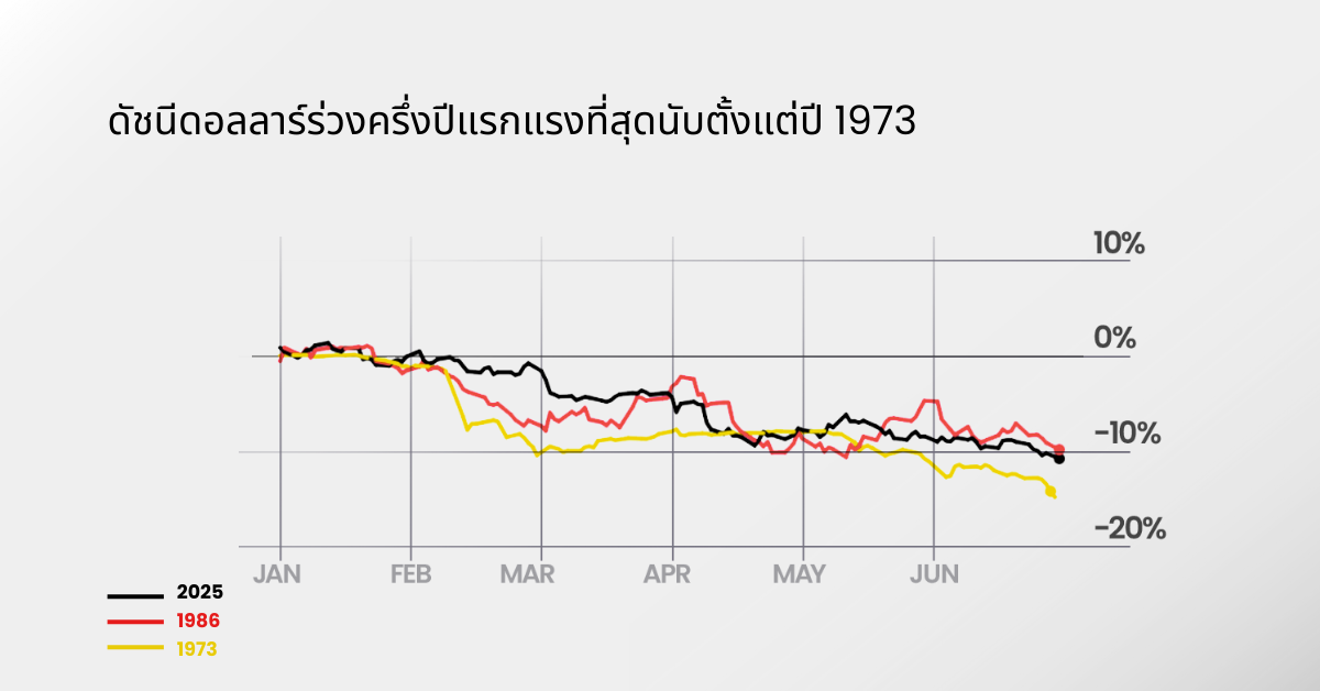 ในช่วง 6 เดือนแรกของปี 2025 ดัชนี DXY ร่วงลงประมาณ 10.8% ซึ่งถือเป็นผลงานครึ่งปีแรกที่ย่ำแย่ที่สุด นับตั้งแต่การร่วงลง 14.8% เมื่อต้นปี 1973