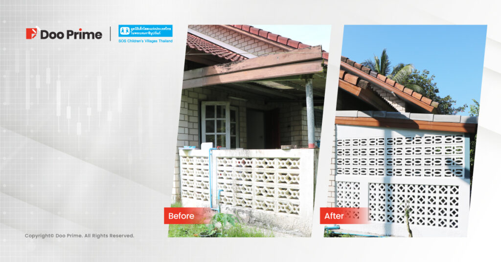 Là doanh nghiệp tài chính đi đầu trong các hoạt động thực hiện trách nhiệm xã hội (CSR), Doo Prime mong muốn được chia sẻ và hỗ trợ phần nào với các trẻ em đang gặp hoàn cảnh khó khăn. Đây cũng là cơ sở để các em được sống trong một môi trường tiện nghi và thoải mái, từ đó đáp ứng được mọi nhu cầu cơ bản trong cuộc sống thường nhật. Và cũng chính vì lẽ đó mà Doo Prime đã tiến hành quyên góp 350.000 THB cho Làng Trẻ em SOS Thái Lan nhằm hỗ trợ chi phí cải tạo nhà ở.