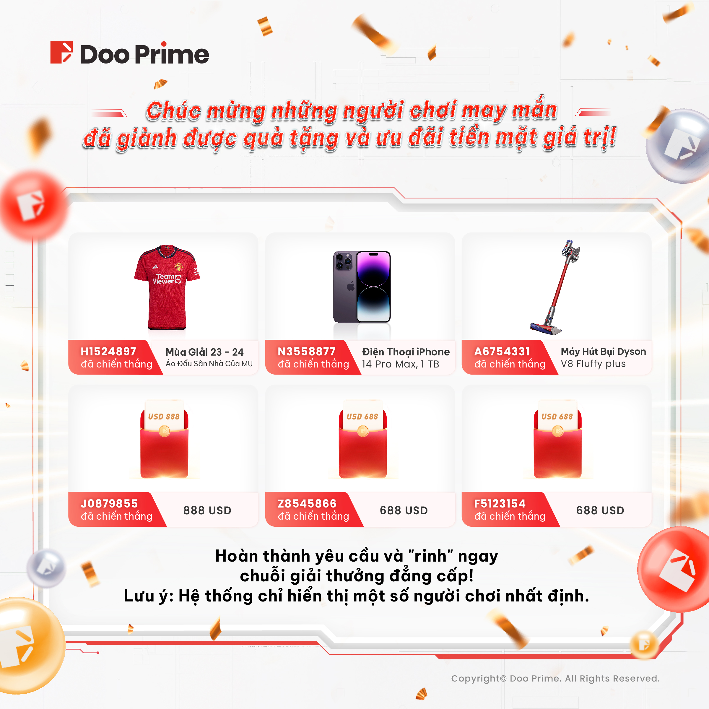 Với việc tung ra hệ thống phần thưởng đây hấp dẫn, chương trình đã thu hút sự quan tâm và chú ý của quý khách hàng trên toàn cầu. Đáng chú ý, nhiều người chơi may mắn đã nhanh tay giành được quà tặng, trong đó bao gồm áo đấu sân nhà mùa giải 23-24 của Manchester United, iPhone 14 Pro Max 1TB, máy hút bụi Dyson V8 Slim Fluffy Plus, cùng nhiều ưu đãi tiền mặt có giá trị lên đến 888 USD.