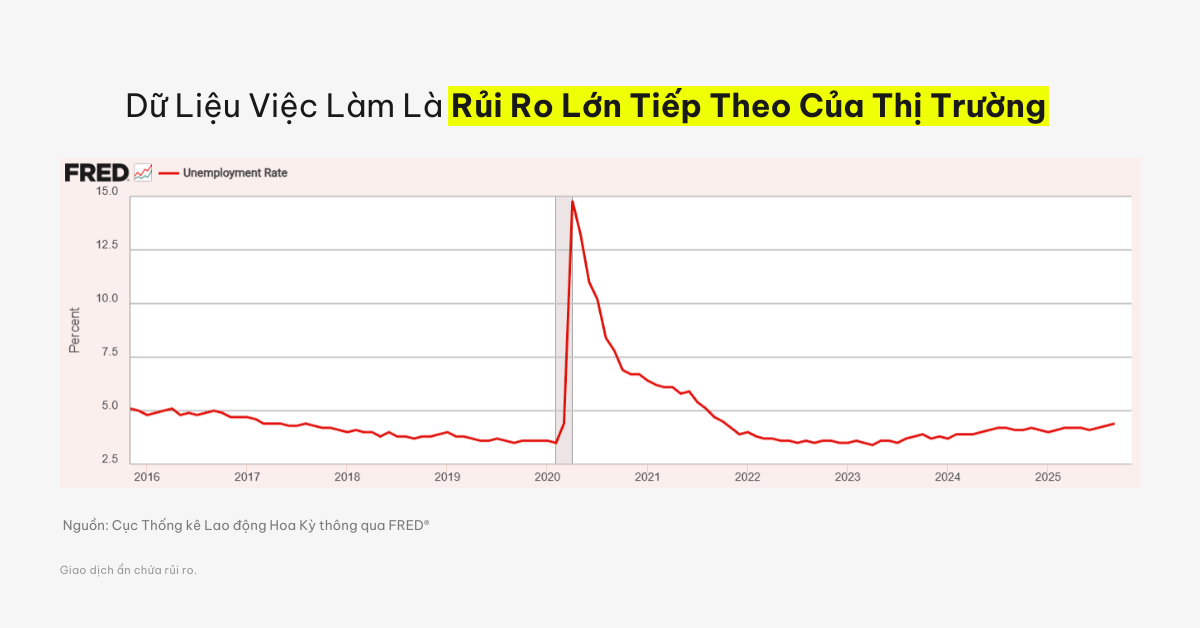 Nếu dữ liệu Bảng Lương Phi Nông Nghiệp (NFP) bắt đầu suy yếu mạnh và tỷ lệ thất nghiệp tăng nhanh, các đợt cắt giảm lãi suất có thể bị xem là phản ứng trước sự căng thẳng về kinh tế thay vì một sự điều chỉnh chính sách mang tính hỗ trợ. Trong lịch sử, những giai đoạn Fed nới lỏng mạnh thường đi kèm với mức biến động thị trường cao hơn.