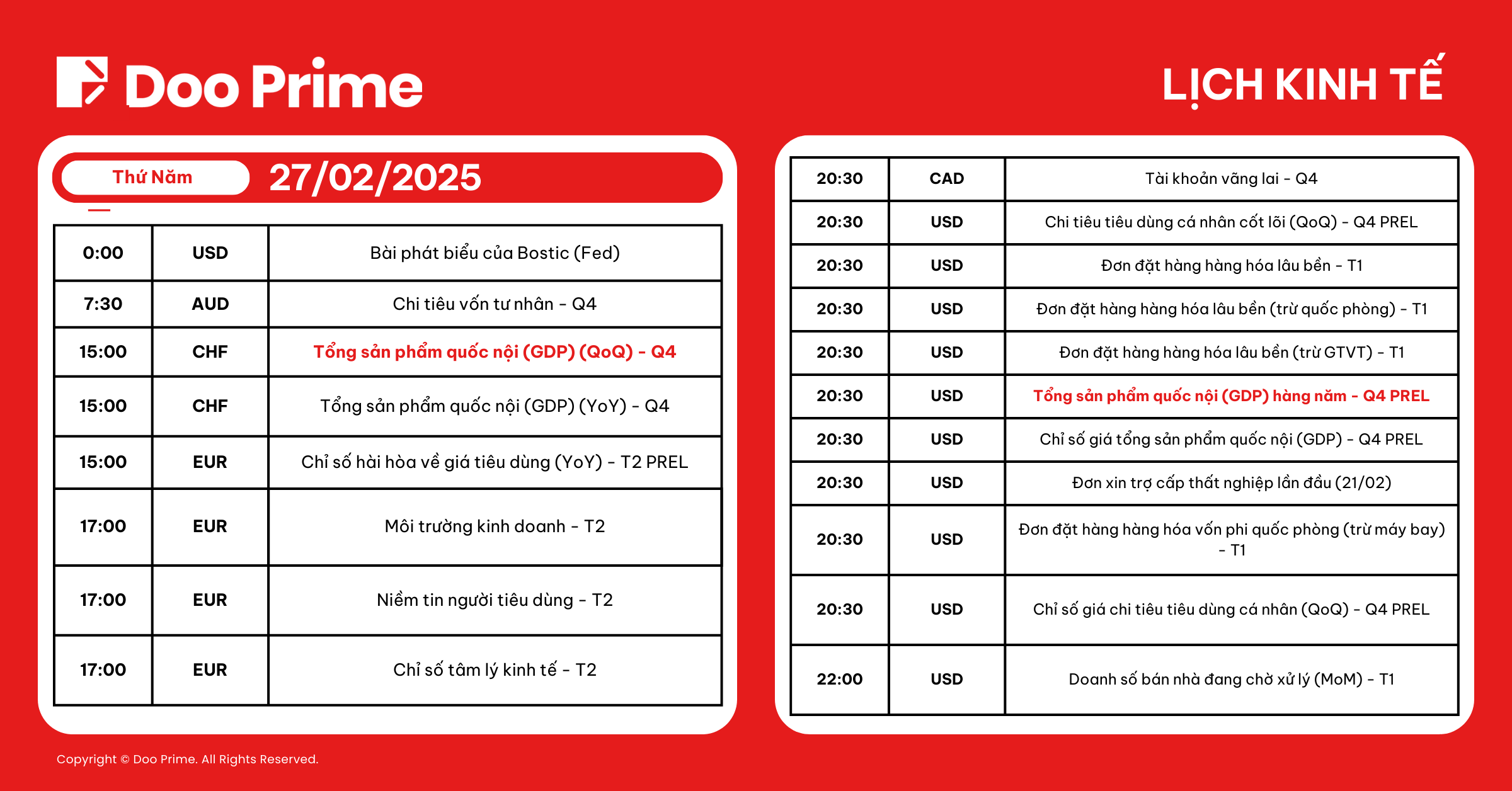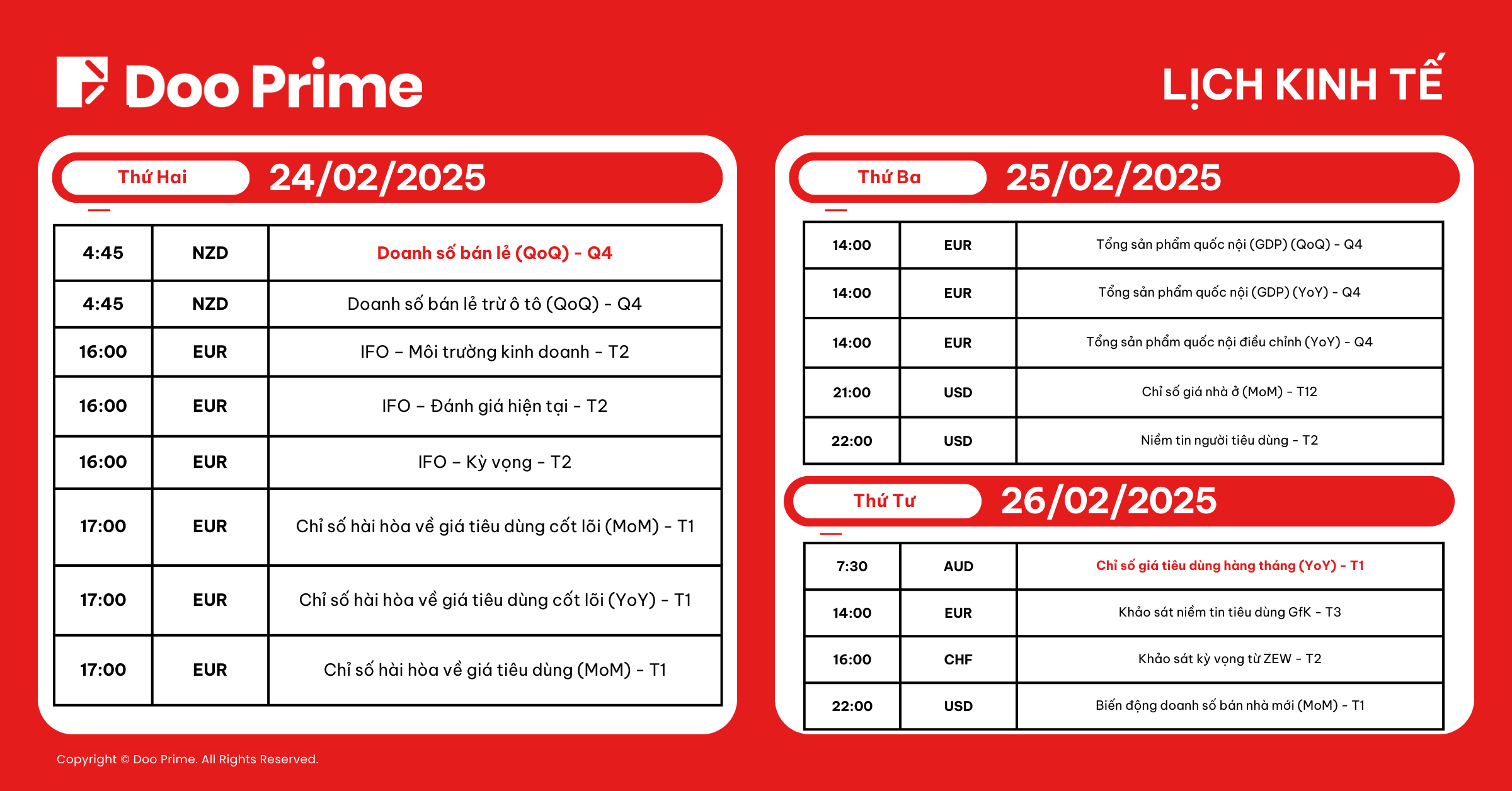 Doo Prime xin thông tin đến bạn những sự kiện kinh tế nổi bật từ 24/02 đến 28/02/2025.